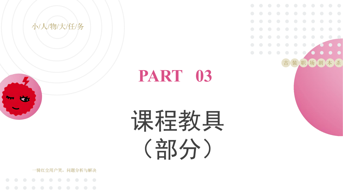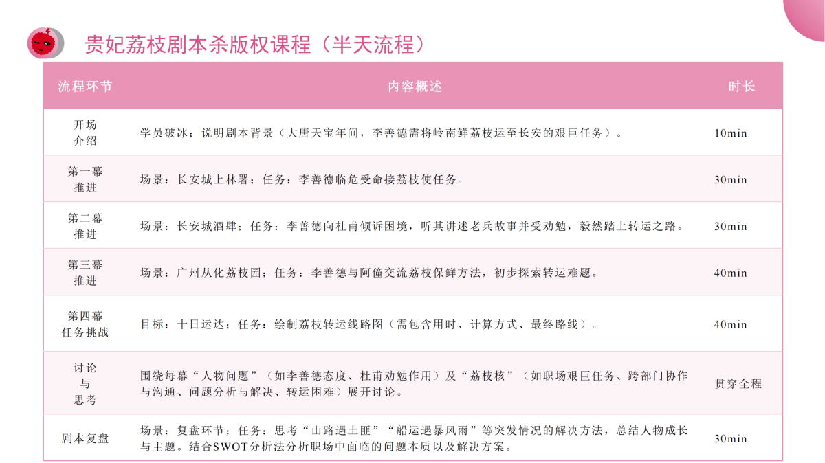 市场上关于问题分析与解决的课程有很多, 但教学形式单一,教学效果十分有限,为了让学员学习之后能够起到高效、持续的转化效果,我们在深研教学设计的基础上,创新教学形式,结合剧本杀的玩法,嵌入机制游戏,将解决问题的 思维方式融入到剧本中,剧本杀模拟演练+实际工作问题解决演练,双实战、高卷入的教学过程,充分调动学员的情绪脑和理性脑,让教学效果翻倍,转化效果更佳。最终通过问题分析与解决的系统学习,将复杂的问题简单化,简单的问题标准化,标准的问题流程化,流程的问题系统化,提供一套寻找最优路径与最小阻力的解决问题的方法,以此实现问题高效解决。