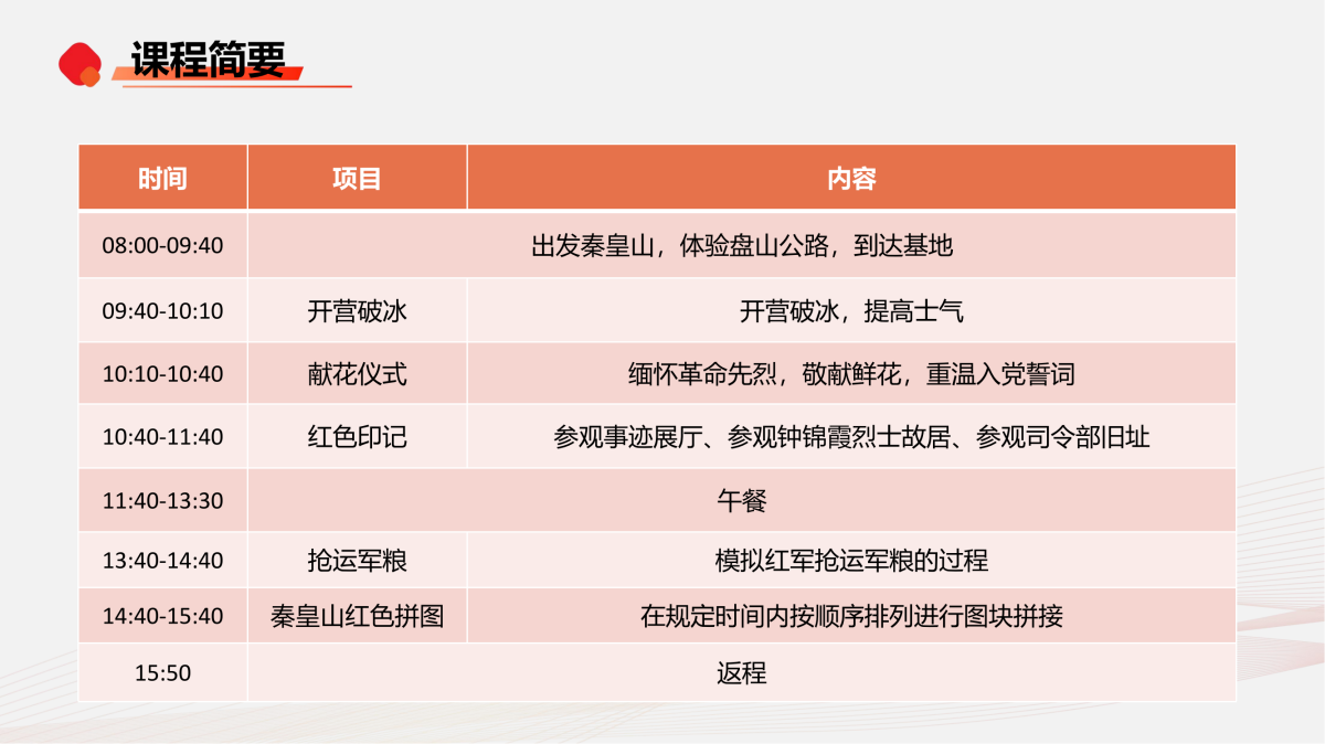 了解身边的革命历史,培养学员对革命先烈的尊重和感激之情,加深爱国情怀。
