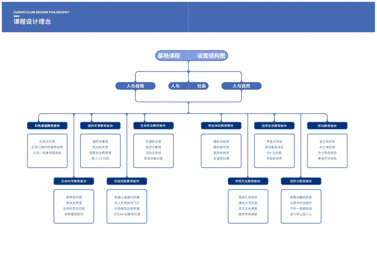 基地以“一心、两轴、五区域”为布局,“一心”即综合实践体验中心,“两轴”即学生综合实践体验轴、成人党团培训体验轴,“五区域”即教学实训区、生活休息区、体育运动区、户外拓展区、接待展示区。同时基地引进华南师范大学研基地以国家《中小学生综合实践活动课程指导纲要》为指导,开设生命科学实验室、人工智能馆、元宇宙VR馆、航空航天馆等二十六个主题场馆,目前已经研发出十大课程板块、110余门适合小学到高中全学龄段的综合实践活动课程,为清远市教育高质量发展和全民国家安全教育贡献国企力量和担当。
