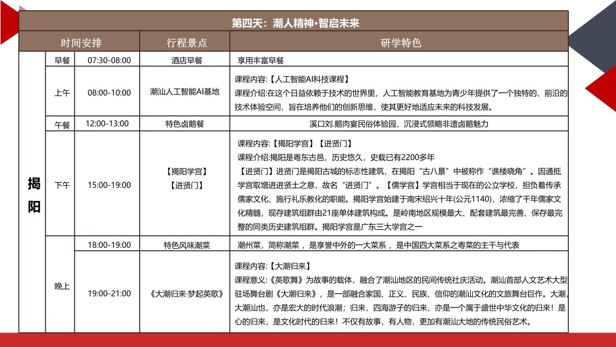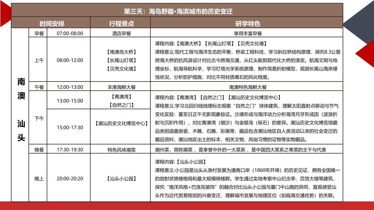 潮汕地区(涵盖汕头、潮州、揭阳、汕尾)是中国东南沿海独具特色的文化圈,素有“海滨邹鲁”“美食之乡”“华侨之乡”的美誉。这里不仅是古代海 上丝绸之路的重要节点,也是近代中国改革开放的前沿阵地。潮汕文化融合了中原古韵、海洋文明、侨乡特色,形成了独特的语言、饮食、工艺和商贸传统。 同时,潮汕人敢闯敢拼的“红头船精神”和现代科技产业的崛起,也为研学提供了丰富的实践案例。