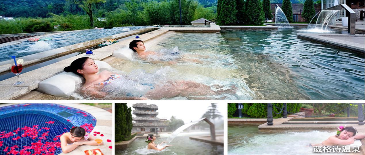 崴格诗温泉传承了瑞士稀世小苏打温泉,38个极富养生特色与自然生态为一体的室外温泉池,与周围的自然环境融为一体,更有国内独一无二的古堡温泉、新奇体验的“碳桑拿”。 群山环绕,悠享原生态纯氧森林。置身其中凡尘琐事涤荡殆尽,顿觉澄明通透、云淡风清;让您在私密的温泉之旅中回归大自然,茂密的竹林加上小桥流水让您徜徉在花香雨林中,在此时此刻感受到崴格诗的唯美与浪漫。具有浓郁的欧陆风情的主题休闲度假酒店,庄园内保持原生态环境,结合了水、林、泉、果巧妙的风景结构
