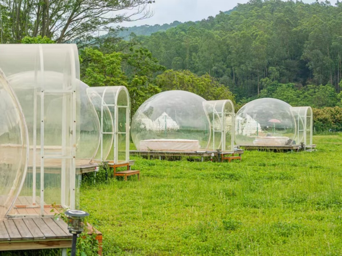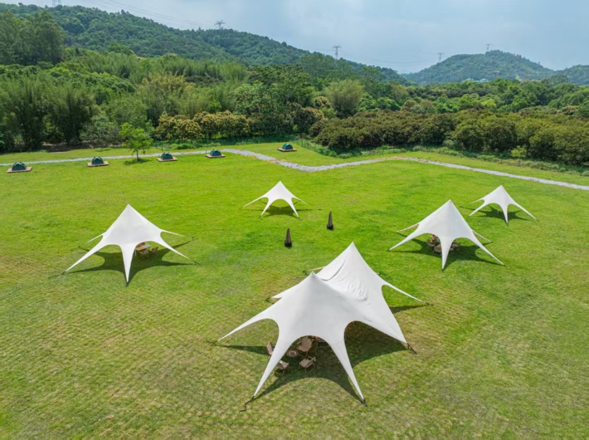 3个大型草坪可容纳300人 || 10个大床房帐篷 || 8个自搭帐篷地台 || 5个星空泡泡屋圆床房。全场30个电位供应用电。
