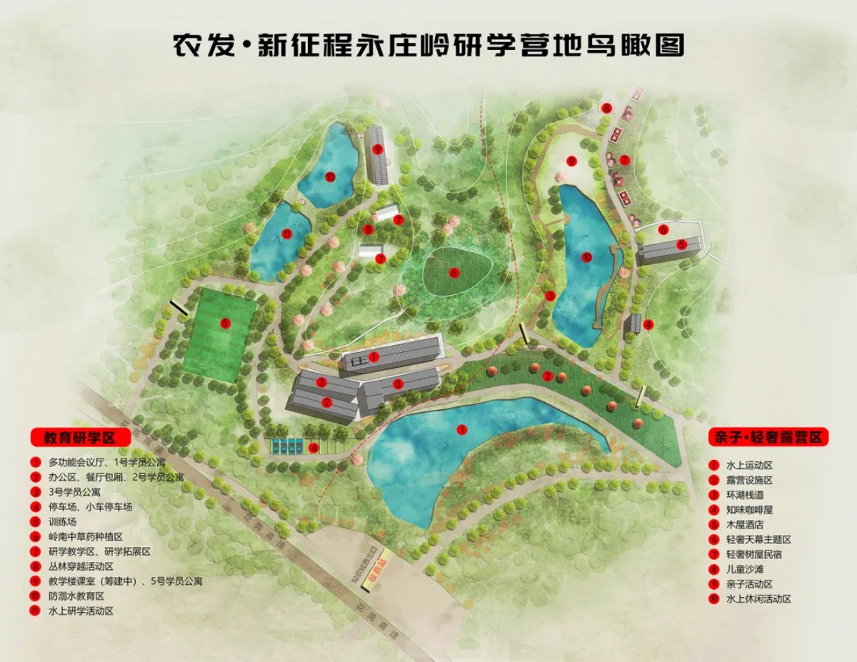 研学教学实践区主要配套有:会议多功能报告厅、营房、餐厅、生态课室,操场等营区基础设施,核心打造劳动实践教学区、水上运动体验区、户外拓展实施区、科技+农业教学示范区,中草药种植识别区、航天科技研学区等多个主题的研学教育实践功能区。研学营地可以满足约600人同步“食、宿、研、学”活动的开展。