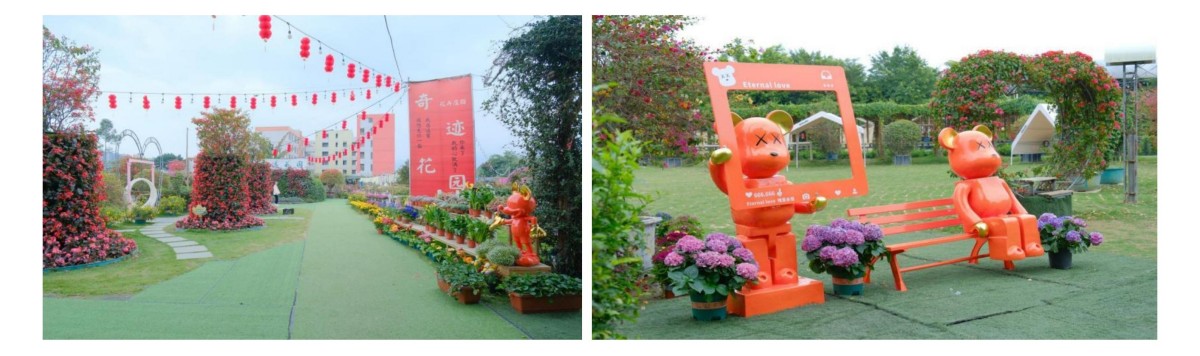 花卉庄园园林餐厅集花海景观与地道粤式农家菜于一体。餐厅以“正宗广府味,粤食越想食”为核心理念,主打现 点现烹的农家风味,食材每日新鲜直供,镬气十足。园内绿树环绕,帐篷与花艺造景相映成趣,营造出“室内营地”般 的野趣美学空间,是本地人聚餐常选地。