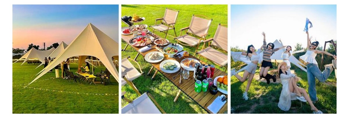 野奢美学营地:花丛中的纯白帐篷、秋千、心形吊椅,营造浪漫电影感。夜幕下,发光昆虫灯、古风灯笼与极光秀 点亮花园,光影交织如梦境。