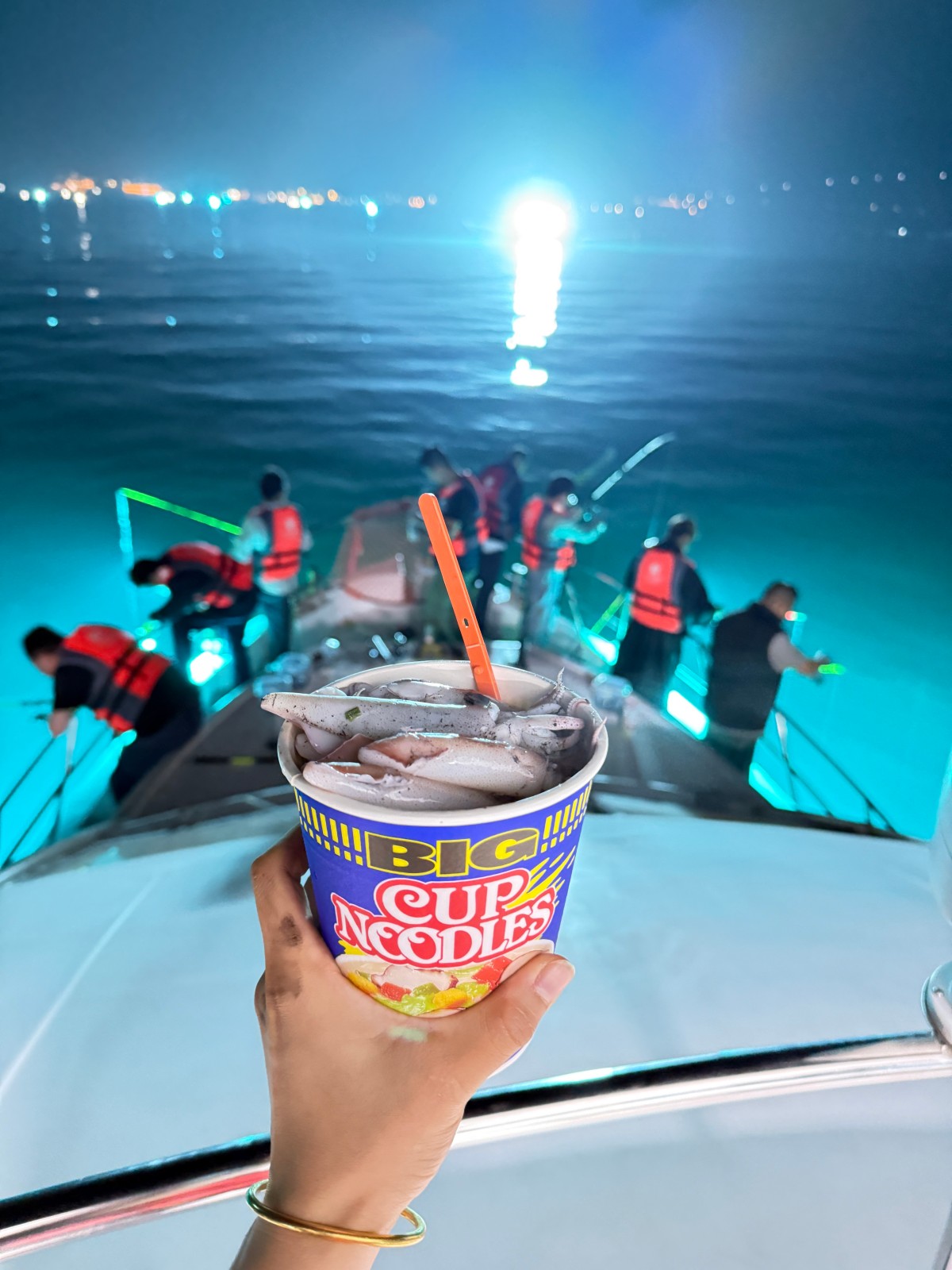广东人把鱿鱼叫做吹筒,吹筒仔就是小鱿鱼。因为吹筒仔有趋光的爱好,所以更适合夜钓。被灯光吸引到船边的微生物引来了小鱼,小鱼也就引来了吹筒仔。