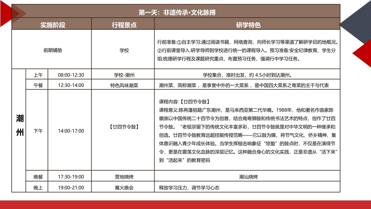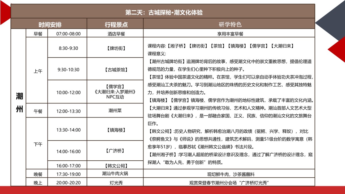 潮汕地区(涵盖汕头、潮州、揭阳、汕尾)是中国东南沿海独具特色的文化圈,素有“海滨邹鲁”“美食之乡”“华侨之乡”的美誉。这里不仅是古代海 上丝绸之路的重要节点,也是近代中国改革开放的前沿阵地。潮汕文化融合了中原古韵、海洋文明、侨乡特色,形成了独特的语言、饮食、工艺和商贸传统。 同时,潮汕人敢闯敢拼的“红头船精神”和现代科技产业的崛起,也为研学提供了丰富的实践案例。