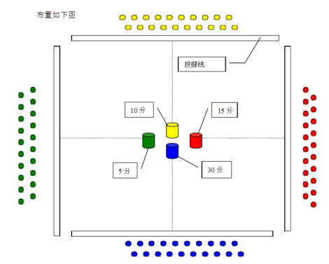 数,各颜色桶代表不同的分值,每轮投掷后把不同颜色桶中的同色球分数相加,得出各队成绩。 每轮取