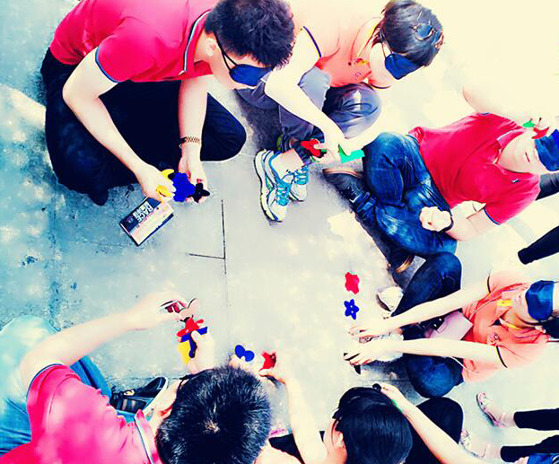 受形状,通过询问教练得知板块的颜色。不允许触摸其他人的板块,通过团队智慧,得知开始前教