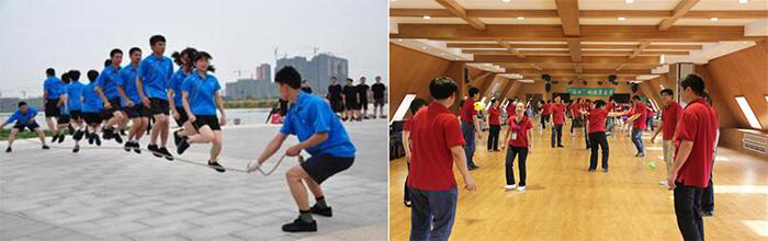 跳大绳:两人摇绳,其余人依次通过。大绳不能空转,所有人都要参与(包括前期摇绳二人)。