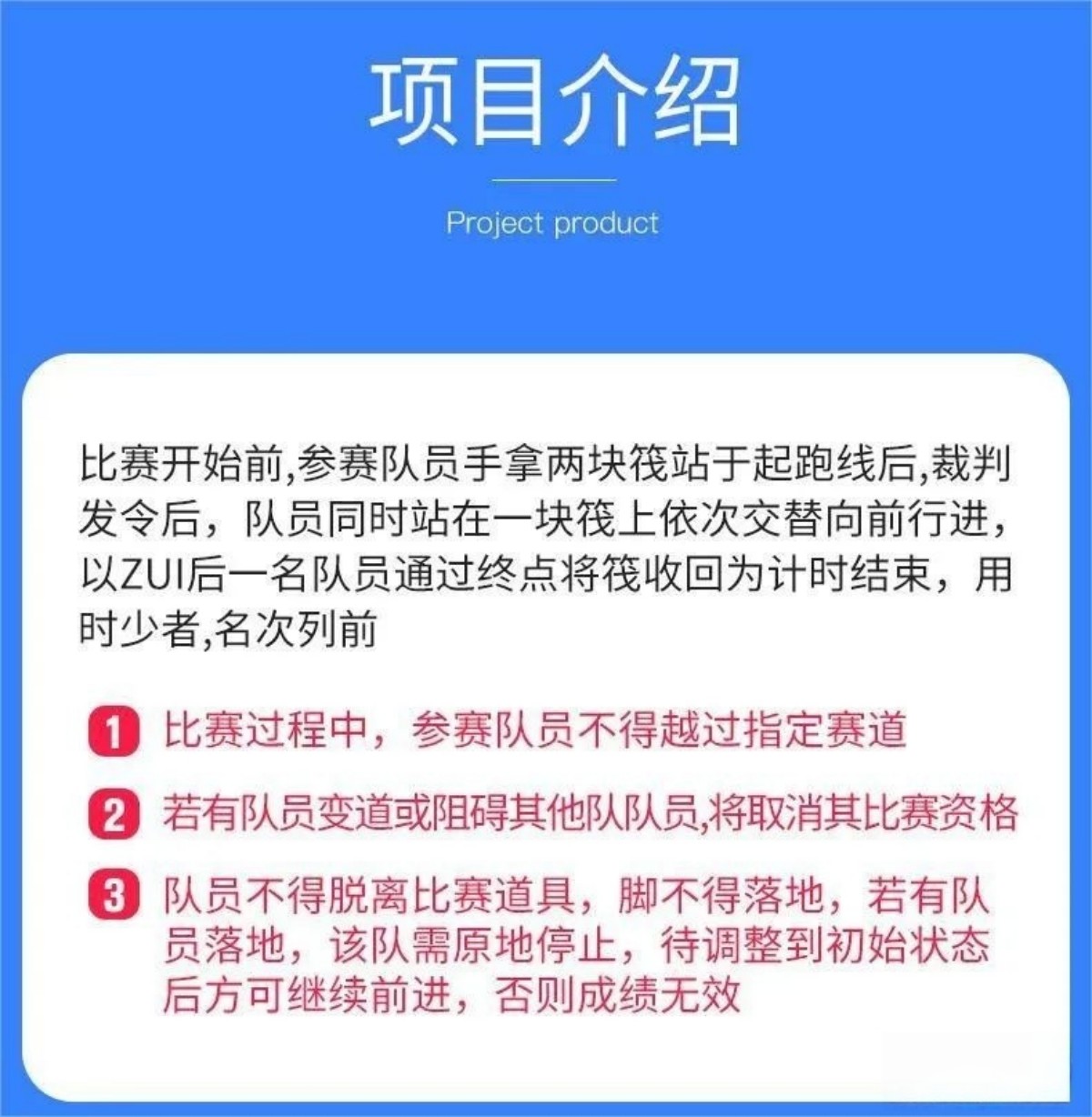 比赛开始前,每组两块竹筏站于起跑线后,裁判发令后,成员一起站上同一竹筏,想方法运用另一竹筏做交换板,小组队员通过脚踩交替使用的两个竹筏向前行进;尽最快的速度达到终点;参赛人员的任何部位在比赛中途不得触地,直到比赛人员和竹筏全部通过终点线所在垂直平面为计时停止,用时少者名次列前。