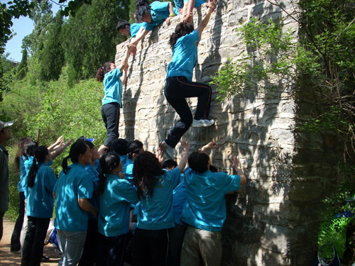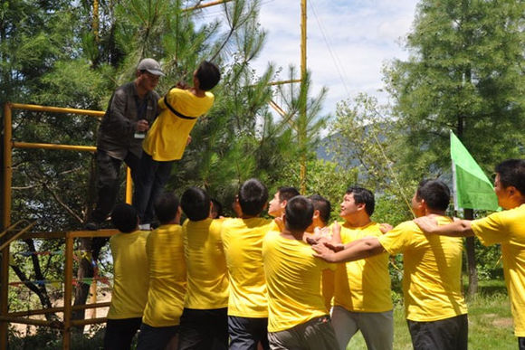 最后一个项目俗称‘毕业墙’4.2米高墙,光滑,没有任何的工具,要求所有的队员都要翻越过去,才算胜利。如何设计合理的人墙,如何合理的支配体力,谁是第一个,谁是最后一个,都是要大家思考的事情。我们黄队队长承担起最后一个翻越的角色。全队一共40名队员,在天气湿度大于70%,气温35°的情况下,难度可想而知,只有齐心协力,才能完成任务。虽然由于身上的旧伤让我无法参与翻越,但是我一直在承担托人爬梯的工作,告知每一个伙伴如何蹬踩,以致减少人墙的痛苦。我们运送的顺序是:大(男生)、小(小女生)、大(男生)、小(小女生)大(大女生)、大(男生),这里的大是相对体重较重的伙伴,依次顺序向上翻越。由于伙伴们合理支配体力,合理的人员的穿插搭配,40人成功的翻越毕业墙,此项训练成功。汗水、泪水化为血液流淌在每个伙伴的心间。