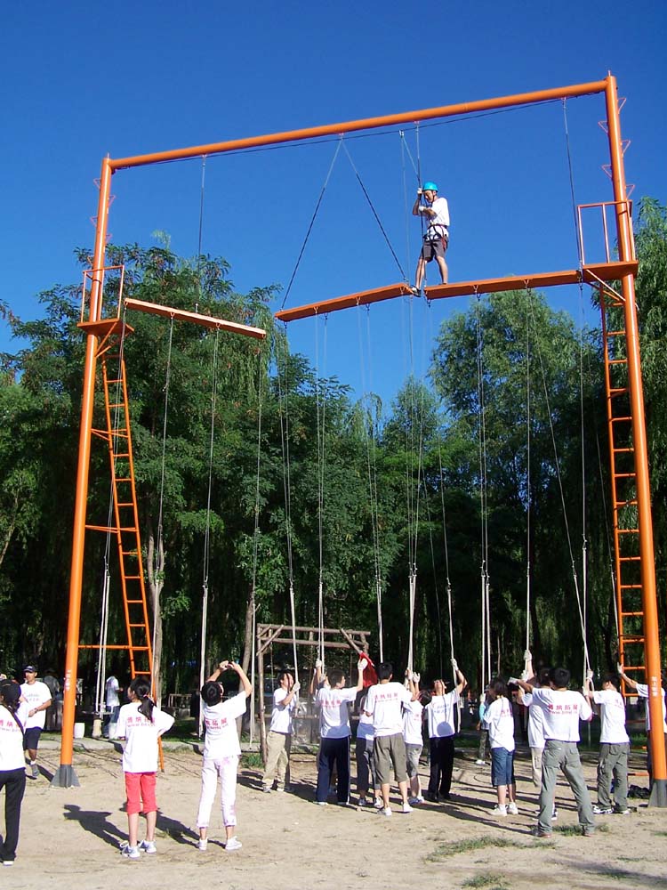 然后是“断桥”项目,这个项目完全是自我内心的挑战,在8米的高空,跨度1.2米的断面,让大家心里多少都有些恐惧。我们首先安排了一个胆子大的男生打头阵,老师呢,也是把断面的跨度缩小一点,这个男生果然没有让大家失望,轻松的跨跃,在下面的伙伴爆发出热烈的掌声。他轻松的完成,给我们带来了良好的开端。女生们都按顺序完成了项目,我是排在女生最后一个出场,做女生的收尾工作。在爬梯之前我认为很简单的一件事情,可是当我站在断桥上的时候,我后悔了,我向下面大声呐喊:‘我害怕了’,我跟保护老师说:‘我不行了,我跳不过去。’老师回答说:‘你现在只有两个选择,要不迈过去,要不我把你推下去。’我说:‘你还是把我推下去吧,因为我知道有保护绳。’就在此时我听到桥下有伙伴大声喊:‘张姐,你再往前一点,就能跨过去了。’就是这个声音,就是这个力量,促使我向前走了一步,然后大胆的跨出艰难的一步,我成功了,谢谢你们,我的伙伴们。谢谢你们在我心里最恐惧的时侯,给了我力量,帮我下了决心,让我找到了方向,顺利完成任务。此项让我体会到:事情的决策往往就在刹那间。