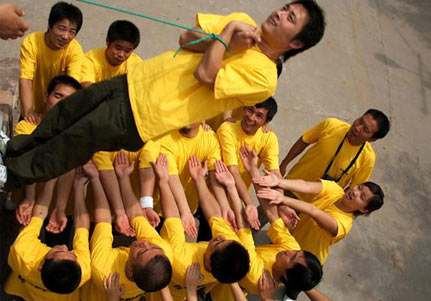 第二个拓展训练科目一信任背摔,志愿者们背站在两米高的平台上,队友用胳膊做缓冲平台接自己的队友。自我挑战的勇气及队友之间的信任,成就我们每一个人。我和队友们的胳膊交叉着组成了一张人网,仰望着站在高台上的队友,准备稳稳接住随时摔下来的队友,那时心里是一份队友对你信任的责任。轮到自己时,站在二,三米的高台,背对着台下的队友们,扭头俯视,大喊着:一定接好我呀,心跳加速,闭着眼,背朝下,摔了下去。"信任背摔",又一次突破了自己,谢谢你们我的队友们。我们要相信"相信"的力量真的很伟大!