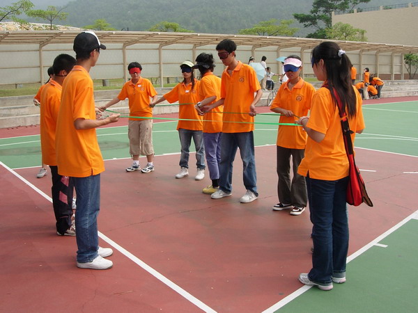 我们进行的第一个培训项目是盲人方阵。先将所有成员的眼睛蒙上,然后告诉学员,我们有几条杂乱无章的绳索,要求大家将绳索结成一条长绳,围成一个最大的正方形。学员只能通过语言交流来完成任务。最后使学员平均分布(若人数为单数,可以不平均)在方阵的四个角和四个边上。学员确认为正方形后,通知培训师并将绳放于脚下,待培训师认可后,方可取下眼罩。戴眼罩前,先观察一下四周的环境,做到心中有数,以免在看不见的情况下,超越范围,发生危险。项目结束时,先闭着眼睛把眼罩慢慢摘下,适应光度后再慢慢睁眼。观察每位学员在活动中与整体配合的能力,注意发现存在个人英雄思想的学员,提醒学员协同作战,启发学员思考谁的建议是最佳的活动后总结。