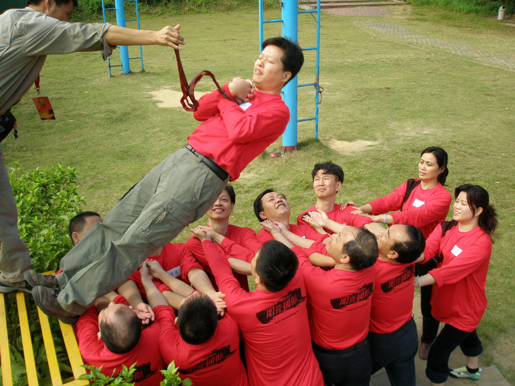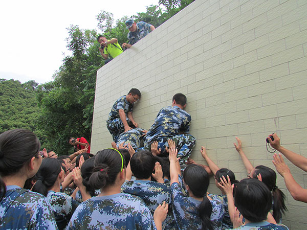 这是昨天拓展的最后一个项目毕业墙,看似无法完成的任务,却在团队的全力配合下顺利达成。活动中,我看到了大家的团结,每个人的可爱,特别是甘当“底座”的伙伴为了其他成员的翻阅甘愿被踩踏甚至负伤,这正是淡蓝的精神,勇于超越,团队配合,战无不胜!谢谢你们让我无法忘记的收获与感动!