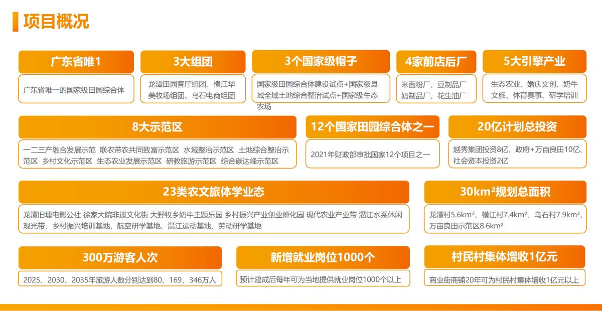越秀风行国家级田园综合体坐落于广州市从化区鳌头镇,规划总面积约21平方公里,目前总投资约20亿元,规划“龙潭田园客厅+横江华美牧场+乌石电商”三大片区组团,构建“两街两园两带四基地”产业布局。项目是2021年财政部批复的第二批12个国家级田园综合体建设试点项目之一,同时叠加全国唯一的县域全域土地综合整治试点、万亩良田示范区和循环生态农业示范区。