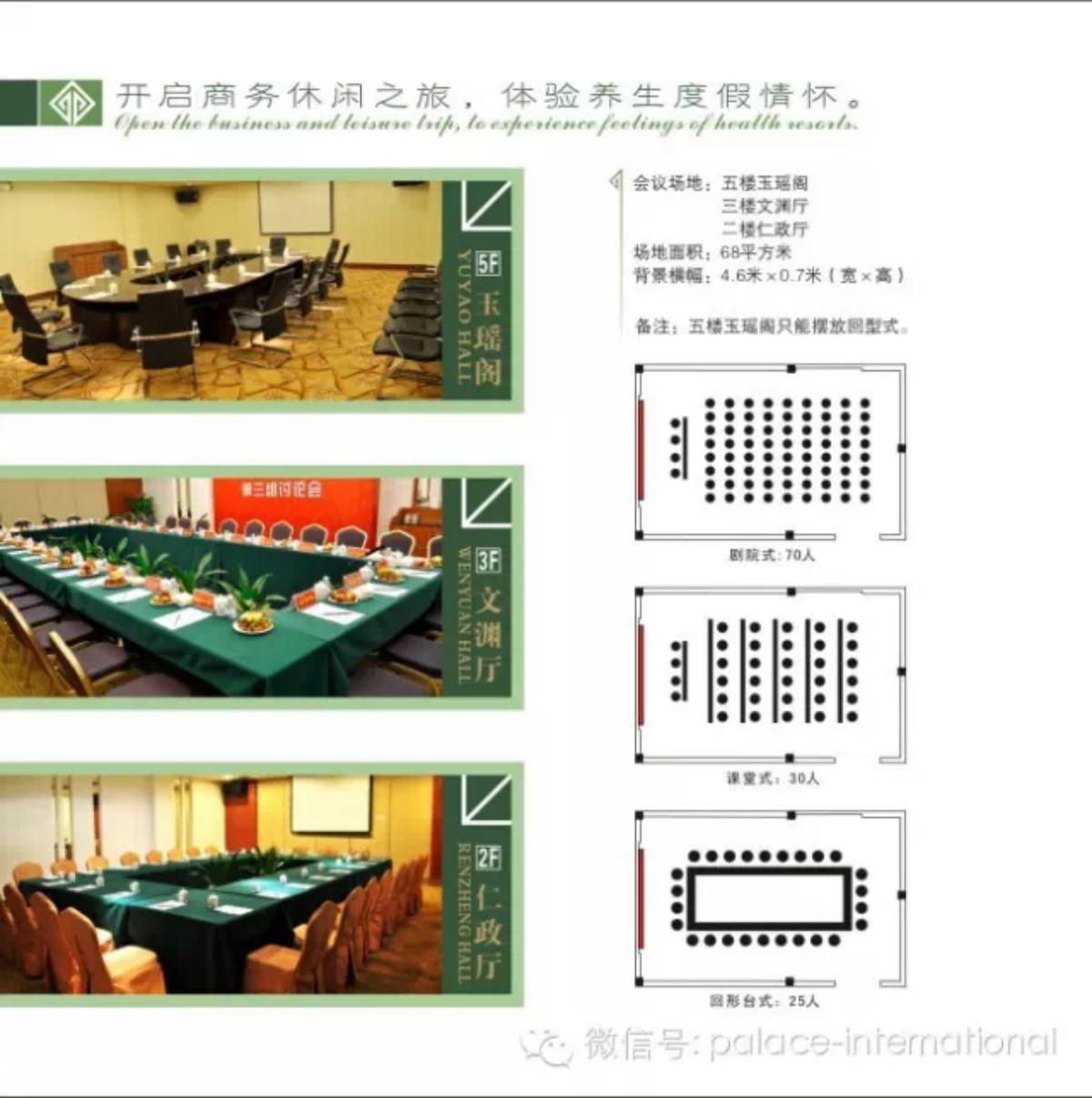 会议厅面积50—70㎡,高2.9m,可容纳人数剧院式70人、课堂式30人、回型台式25人。